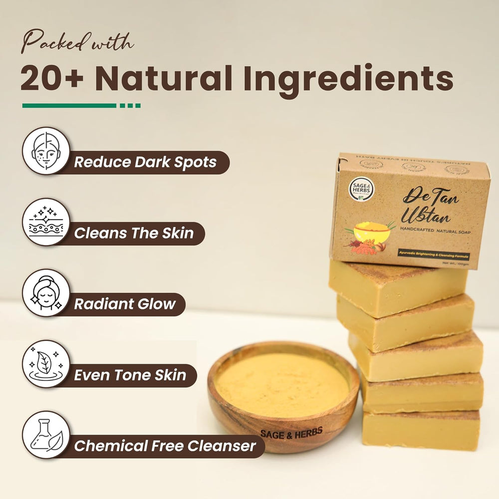 Experience the timeless goodness of traditional skincare with Sage & Herbs Ubtan Soap, a natural, herbal, handcrafted bathing bar enriched with authentic ubtan ingredients for a refreshing and nourishing cleanse. Inspired by age-old beauty rituals, this soap gently exfoliates dead skin cells to reveal brighter, smoother, and healthier-looking skin.