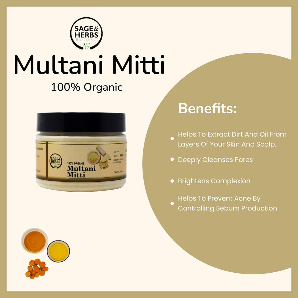 Experience age-old botanical skincare wisdom with our Organic Multani Mitti — a 100% natural clay powder traditionally used in Indian beauty routines for radiant, smooth, and balanced skin. Also known as Fuller’s Earth, this mineral-rich clay absorbs excess oil, unclogs pores, removes impurities and supports both skin and hair care rituals.